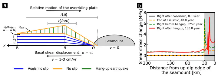 (a) Illustration of a simplified kinematic model depicting the hang-up mechanism. Please refer to the accompanying text for a detailed explanation. (b) Shear stress change obtained from our numerical model along the top interface of the slab at four-times during the hang-up cycle.