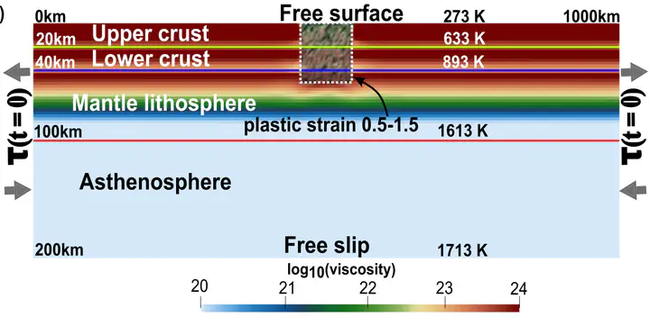 The model domain to be extended by boundary tractions, which is 1000 km in x direction and 200 km in y direction, with three compositional layering (upper crust, lower crust, and mantle). The mantle composition is divided into mantle lithosphere (40-100 km), and asthenosphere (100–200 km) as a thermal boundary where inflow of material allowed through side walls below the mantle lithosphere. The dashed box represents the initial weak zone with random plastic strain values between 0.5 and 1.5. The background is the viscosity distribution.The complex evolution of continental rift systems results from the intricate interplay of external driving forces and the rift system’s responses. For this reason, allowing plate kinematics to emerge from the force balance can provide deeper insights than imposing prescribed velocity boundary conditions. This study investigates the influence of temporally varying driving forces, possibly resulting from changes in slab dynamics, on rift evolution using numerical and semi-analytical models. We examined the effects of varying the timing ($t_i$), duration ($\delta t$), and magnitude ($\delta \tau$) of boundary traction reductions on extension velocities ($V_{E}$). Our models demonstrate that later initiation of traction reduction and slower reduction rates promote continental breakup. A 25% reduction in boundary traction can still lead to continental breakup under optimal conditions, while a 50% reduction generally results in failed rifts. Non-monotonic evolution, including temporary velocity increases during force reduction, is observed and explained by dynamic force balance. Our results show that a continental rift can accelerate towards breakup even when it is currently extending slowly due to a reduced driving force that can arise from many different situations.