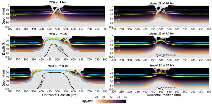 Viscosity field evolution of the constant-traction model (CTM) and the variable-traction model (VTM) at 9, 10, and 10.8 Ma with isotherms at 773, 1273, and 1613 K. Only CTM reached continental breakup.The complex evolution of continental rift systems results from the intricate interplay of external driving forces and the rift system’s responses. For this reason, allowing plate kinematics to emerge from the force balance can provide deeper insights than imposing prescribed velocity boundary conditions. This study investigates the influence of temporally varying driving forces, possibly resulting from changes in slab dynamics, on rift evolution using numerical and semi-analytical models. Our results show that a continental rift can accelerate towards breakup even when it is currently extending slowly due to a reduced driving force that can arise from many different situations.